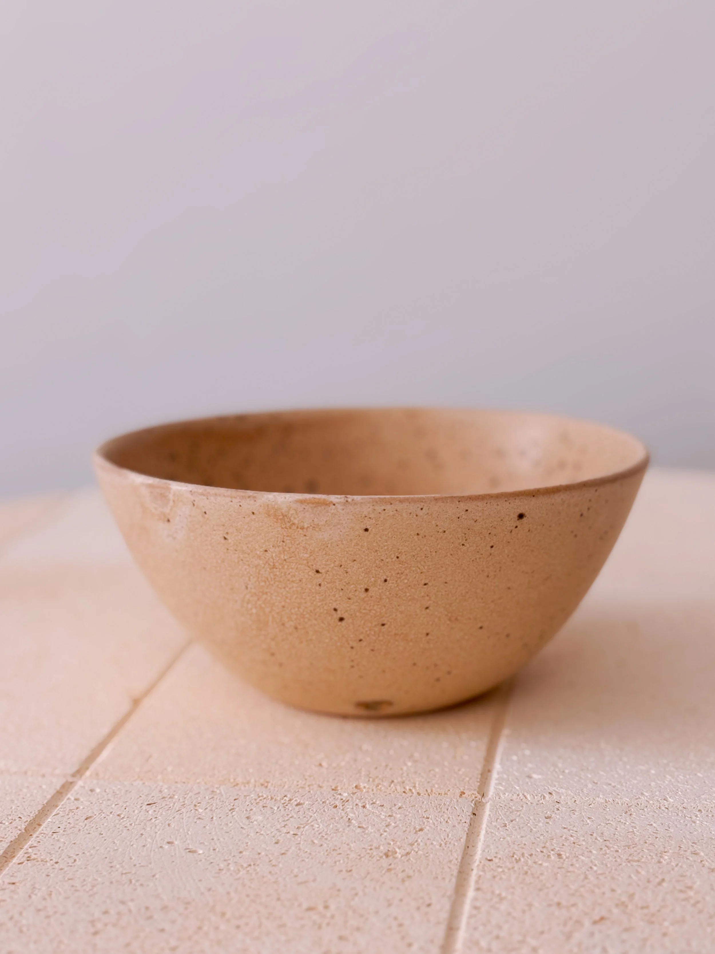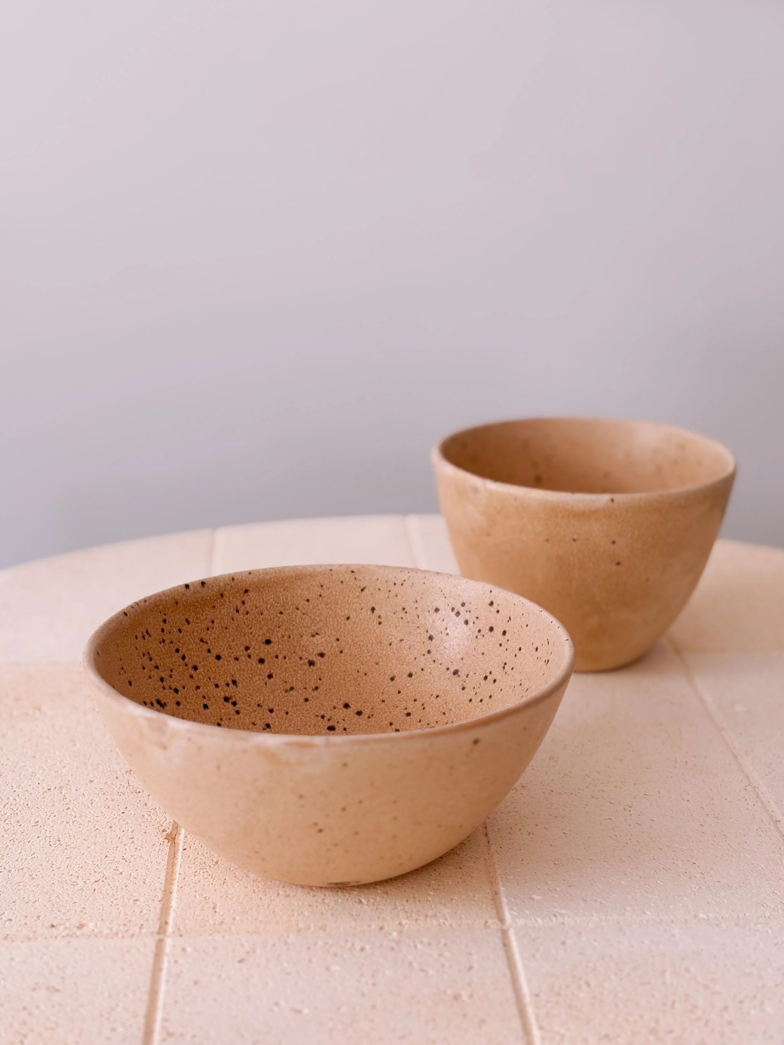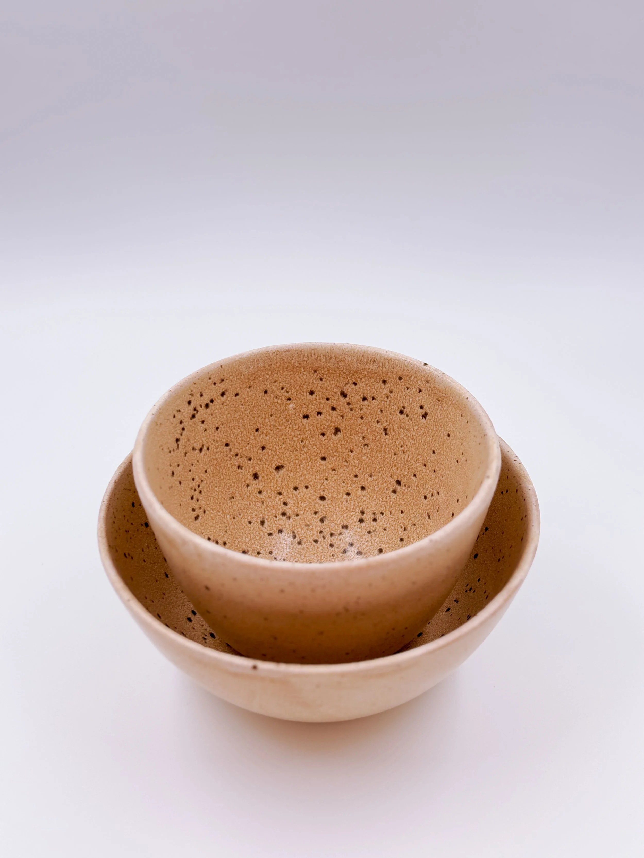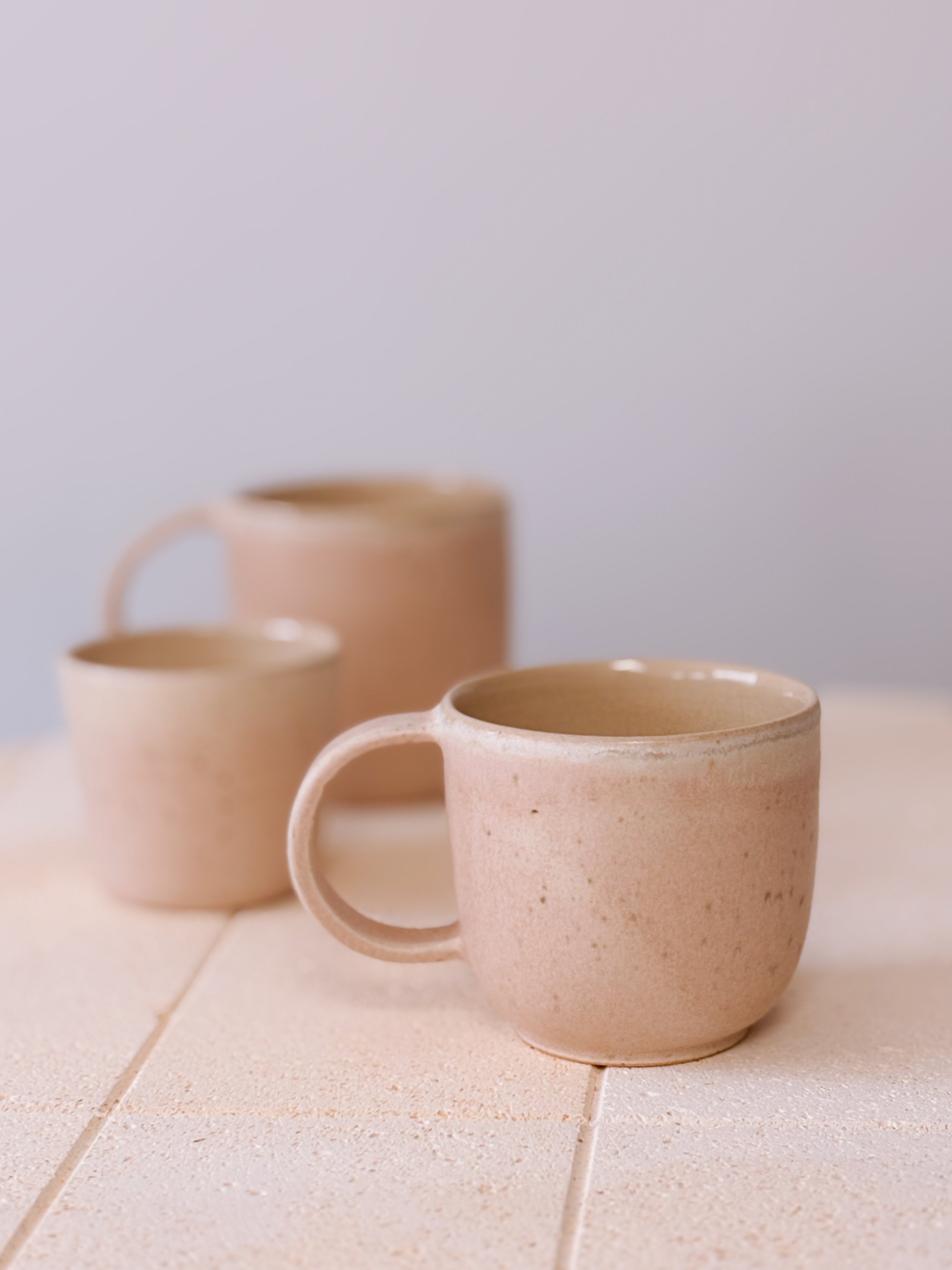 Cada pieza, nacida de un mismo esmalte base, revela un matiz distinto —beige cálido, rosa tenue o azul velado— con un moteado delicado que recuerda a la neblina de las primeras horas del día.